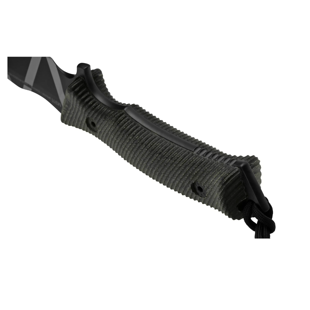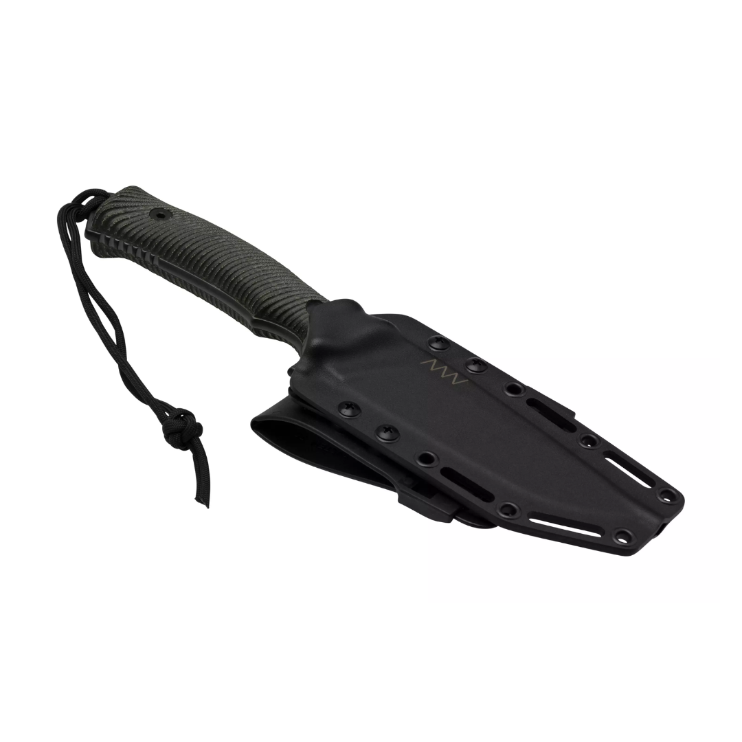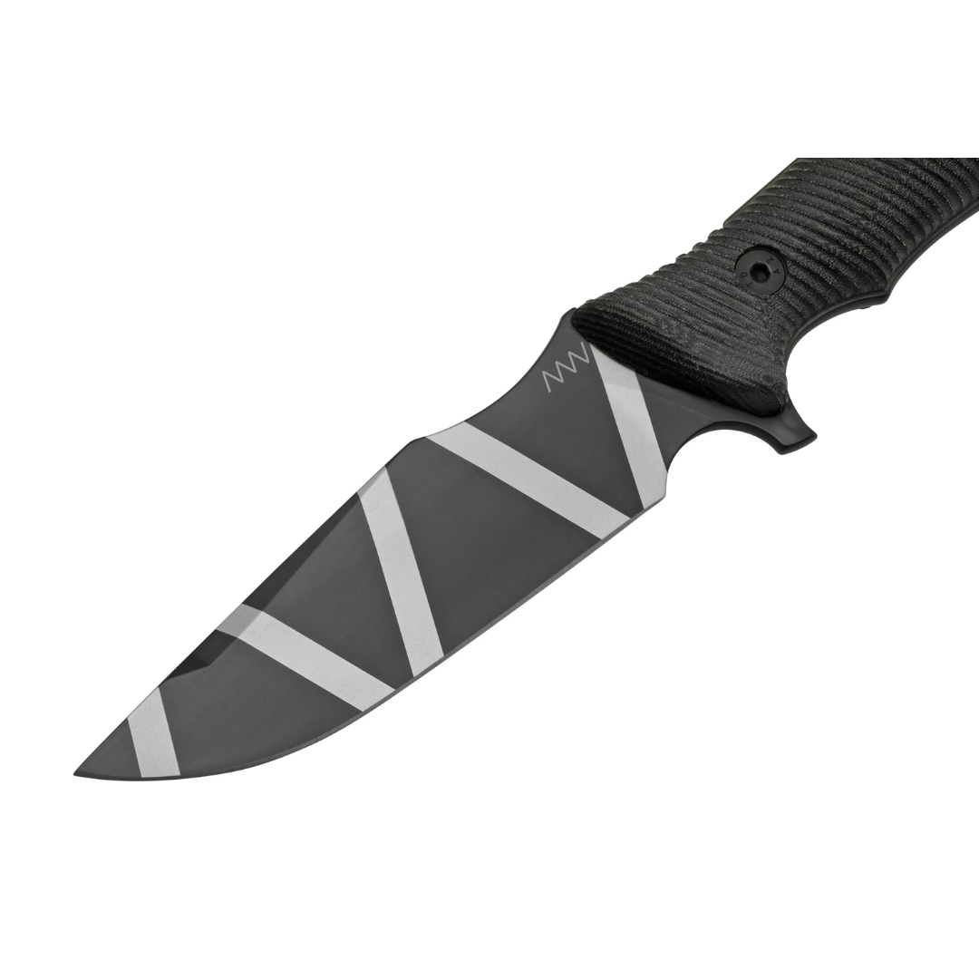 The ANV M311 SPELTER is a robust fixed-blade knife engineered for demanding tactical and survival applications. Crafted in the Czech Republic, it features a 4.9-inch Elmax steel blade with a DLC (Diamond-Like Carbon) camo coating, offering exceptional durability and corrosion resistance while minimizing reflections. The 3D-milled black Micarta handle ensures a secure grip in all conditions, and the self-locking Kydex sheath with MOLLE compatibility provides versatile and secure carry options.