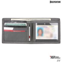 The BFW Bi-Fold Wallet has a slim bi-fold design. There is a clear vinyl window for your DL/ID. The interior has four (4) card compartments and one (1) slip pocket. Paper bill slot fits all major world currencies.